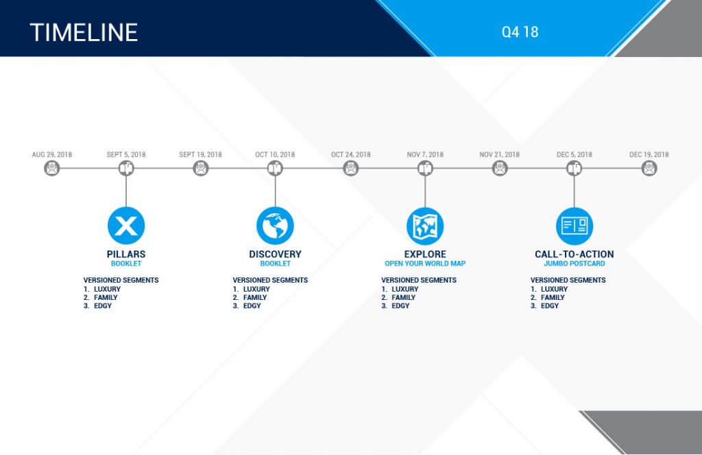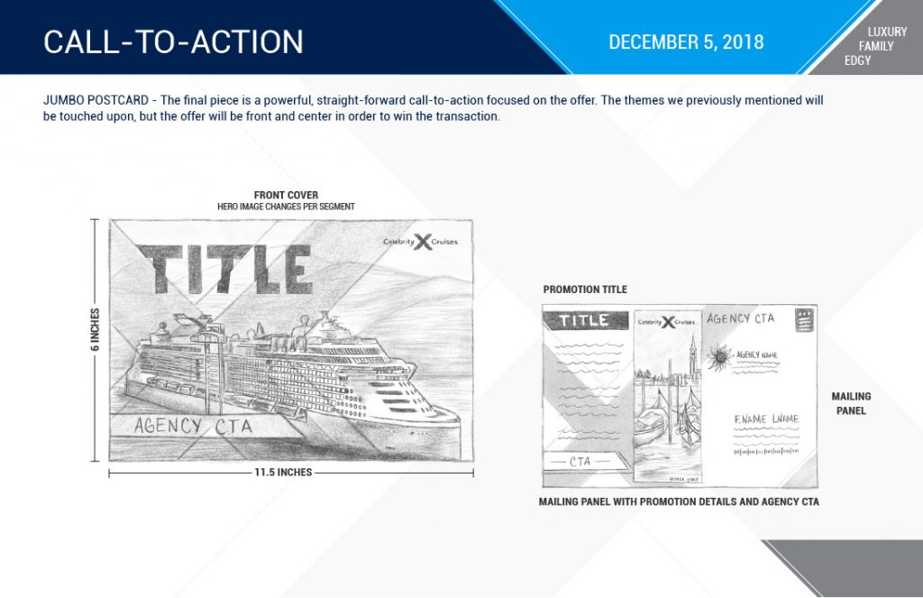 Throughout this ongoing campaign, each marketing piece showcases Celebrity Cruises’ five brand pillars, specifically tailored to influence Highly Targeted Consumers to sail beyond their own boundaries onboard the award-winning ships of Celebrity. Each piece targets three unique client segments with their own personalized messaging, creating more effective and profitable channels that inspire travelers to seek out Celebrity and “open their worlds.”
